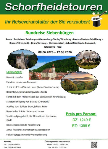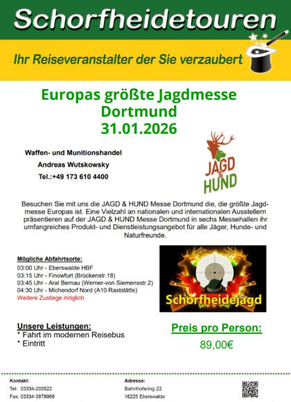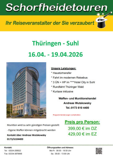 Liebe Jägerinnen und Jäger, Sportschützen und Freunde der Natur,es liegt ein erfolgreiches Jahr hinter uns und viele schöne Momente vor uns. Deshalb ein paar Hinweise für das kommende Jahr. Am Samstag den 31.01.2026 fahren wir mit mehren Busfahrern nach Dortmund zur größten Messe für Jäger, Sportschützen und Naturliebhaber und gutem Essen. Wir organisieren es für jeden unternehmungslustigen Freund, der sich mal einen guten Überblick verschaffen möchte. Nach Suhl fahren wir nun auch schon über 20 Jahre und werden in diesem Jahr in die Manufaktur von Heymwaffen fahren und uns von toller Handwerkskunst überzeugen. Gemütliches Beisammensein und Überraschungen sorgen für gute Stimmung und unser tolles Hotel gestattet beim Essen einen super Ausblick über Suhl. Es lohnt sich also die Koffer zu packen. Im Sommer werden wir nach Siebenbürgen fahren und die Gemeinschaft fördern. Sind auch nur noch Restzimmer zu buchen.PS: In der Jagdzeitung Unsere Jagd 8 / 25 steht ein 4 seitiger Artikel über die Suhl Reise. Ich wünschen Allen ein erfolgreiches und gesundes 2026. Mit freundlichen GrüßenAndreas WutskowskyMobil: 0173 - 610 44 00Büro: 03334 – 20 55 10Email: andreas@schorfheidetouren.de ; info@schorfheidetouren.deWeb: www.schorfheidetouren.de